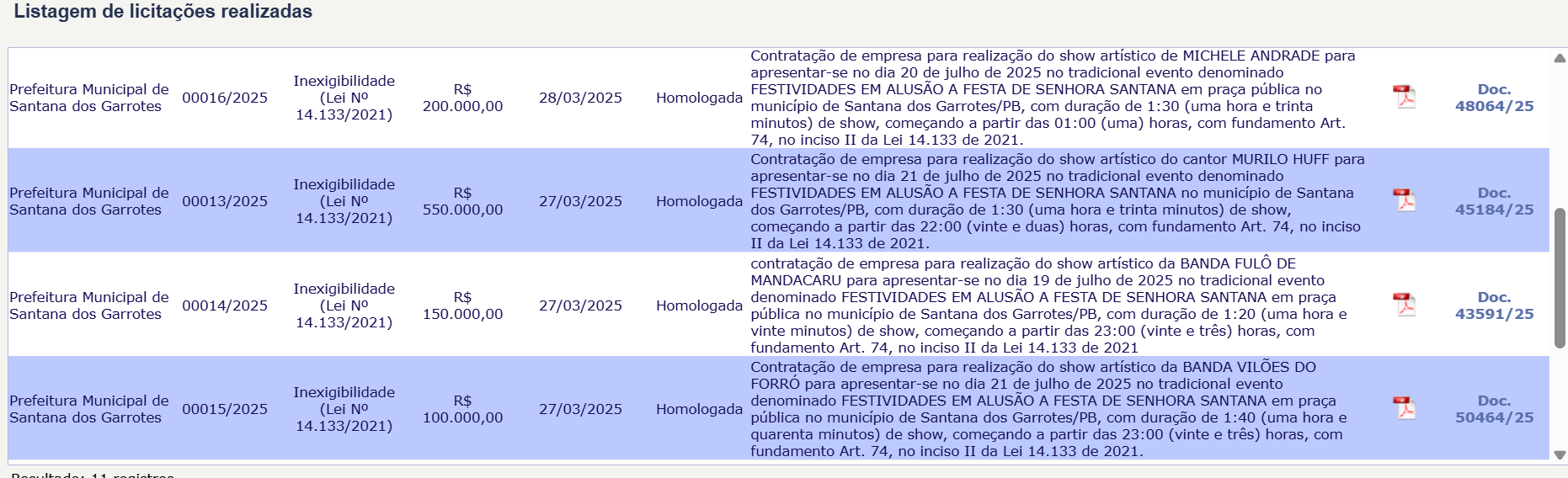 De acordo com levantamento feito pelo Parayba.com.br, a gestão municipal já desembolsou mais de R$ 1,5 milhão apenas em 2025 com a realização de eventos. Os contratos envolvem aluguel de palco, som, iluminação, banheiros químicos e cachês artísticos, incluindo a contratação do cantor Murilo Huff, que recebeu R$ 550 mil por um show de apenas 1h30 de duração, realizado no dia 21 de julho, durante a tradicional festa da padroeira local.