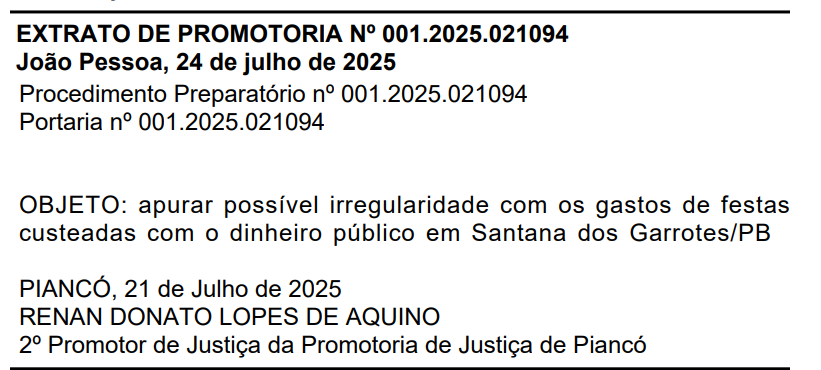 O caso está sob análise da 2ª Promotoria de Justiça de Piancó, que instaurou o Procedimento Preparatório nº 001.2025.021094, assinado pelo promotor Renan Donato Lopes de Aquino, para apurar possíveis irregularidades.