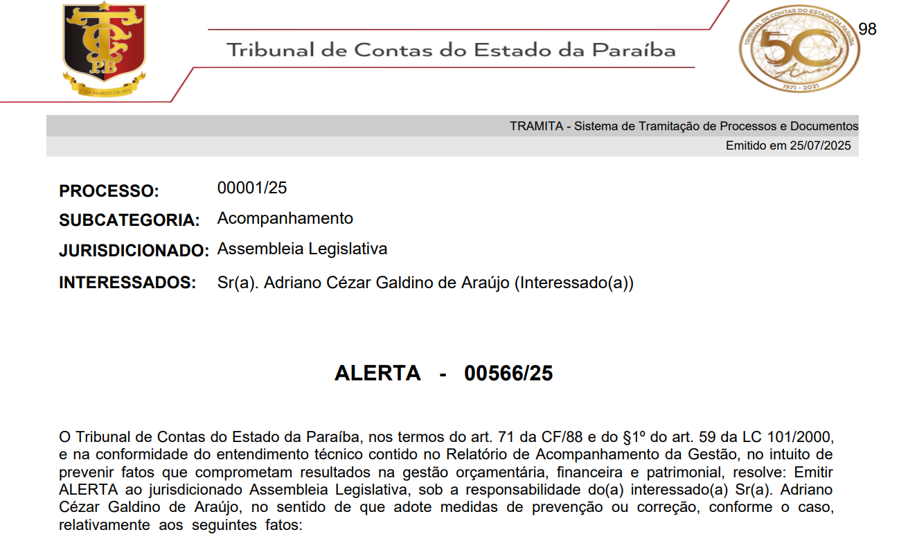 O Tribunal de Contas do Estado da Paraíba (TCE-PB) emitiu um alerta para a Assembleia Legislativa da Paraíba (ALPB) após constatar a indisponibilidade de informações sobre fornecedores da empresa Sin Comunicação, responsável por contratos de publicidade com a Casa.