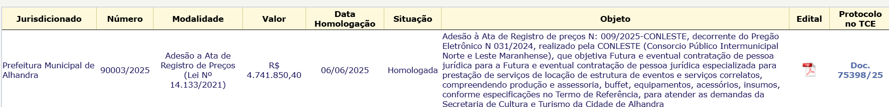 A Prefeitura de Alhandra, no Litoral Sul da Paraíba, homologou um contrato no valor de R$ 4.741.850,40 por meio de adesão à Ata de Registro de Preços nº 009/2025-CONLESTE, oriunda de um pregão eletrônico realizado no estado do Maranhão.