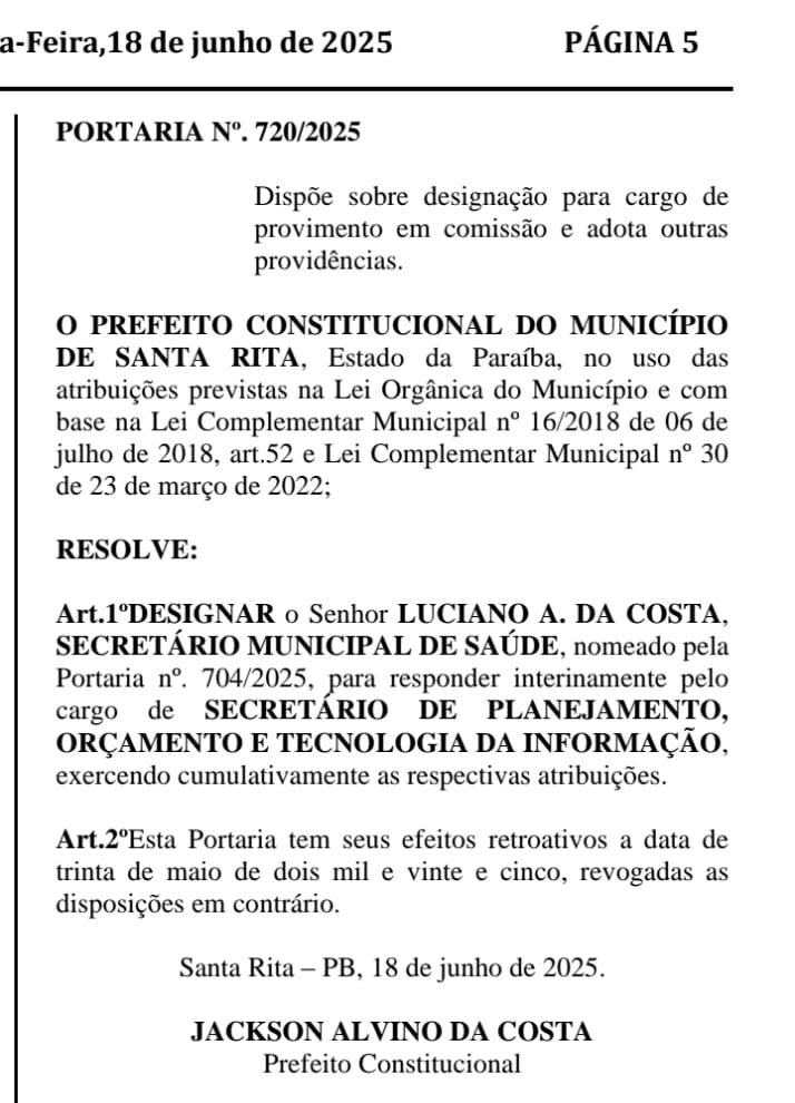 O prefeito de Santa Rita, Jackson Alvino da Costa, voltou a nomear o próprio irmão, Luciano Alvino da Costa, para mais um cargo estratégico dentro da administração municipal. Além de ser o atual secretário municipal de Saúde, Luciano agora também irá acumular o comando da Secretaria de Planejamento, Orçamento e Tecnologia da Informação.