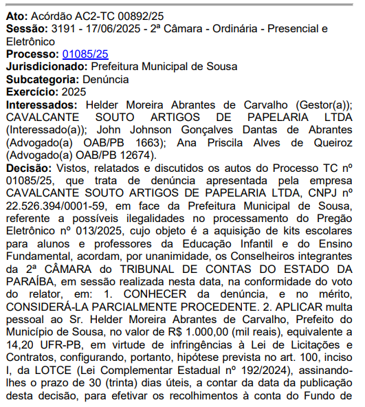 Por unanimidade, os conselheiros da 2ª Câmara do TCE-PB aplicaram multa de R$ 1 mil ao prefeito de Sousa, Helder Moreira Abrantes de Carvalho, por infração à Lei de Licitações, com base na Lei Orgânica do TCE-PB (Lei Complementar nº 192/2024). Ele terá 30 dias úteis para recolher o valor ao Fundo de Fiscalização Orçamentária e Financeira Municipal.