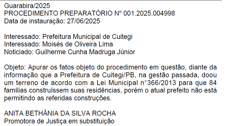 Com apurado pelo Parayba.com.br, a denúncia partiu de informações que chegaram à 4ª Promotoria de Justiça de Guarabira, que agora apura possíveis irregularidades administrativas e até violação de direitos sociais e urbanísticos.