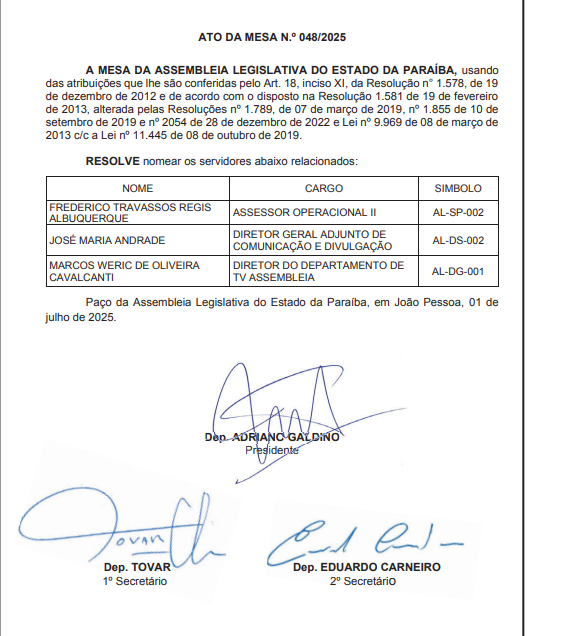 A Mesa Diretora da Assembleia Legislativa da Paraíba (ALPB) oficializou, por meio do Ato da Mesa nº 048/2025, a nomeação de dois servidores para cargos de direção na área de comunicação da Casa. As nomeações foram publicadas na edição do Diário Oficial do legislativo estadual.