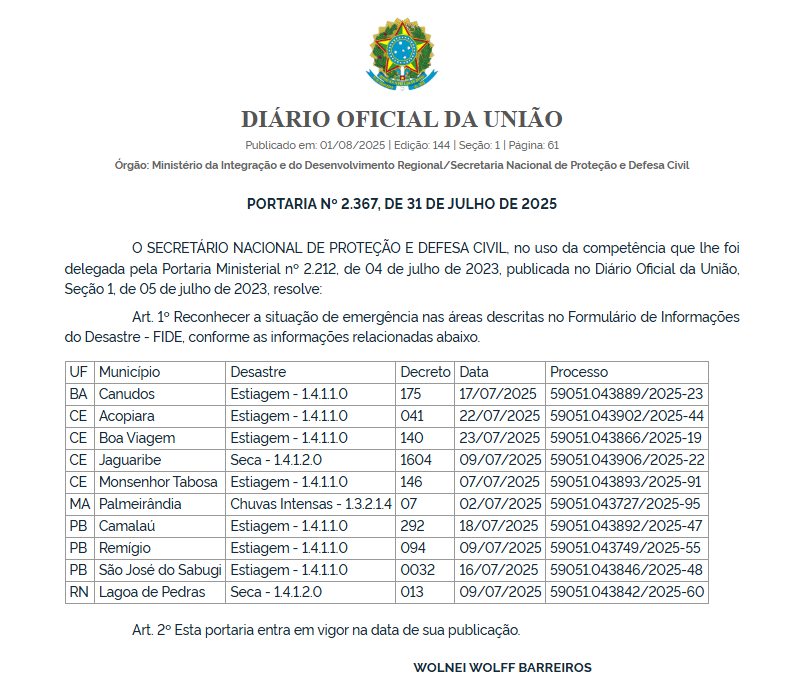 O Ministério da Integração e do Desenvolvimento Regional (MIDR), por meio da Defesa Civil Nacional, reconheceu nesta sexta-feira (1º) a situação de emergência em três municípios paraibanos atingidos pela estiagem: Camalaú, Remígio e São José do Sabugi.