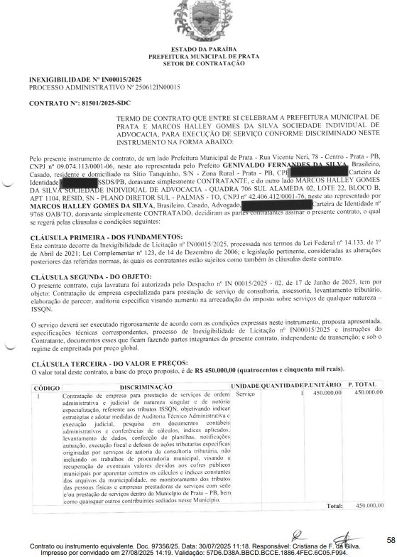 A Prefeitura de Prata, no Cariri paraibano, assinou um contrato no valor de R$ 450 mil com o advogado Marcos Halley Gomes da Silva, por meio de sua sociedade individual de advocacia, para prestar serviços de consultoria e auditoria tributária.