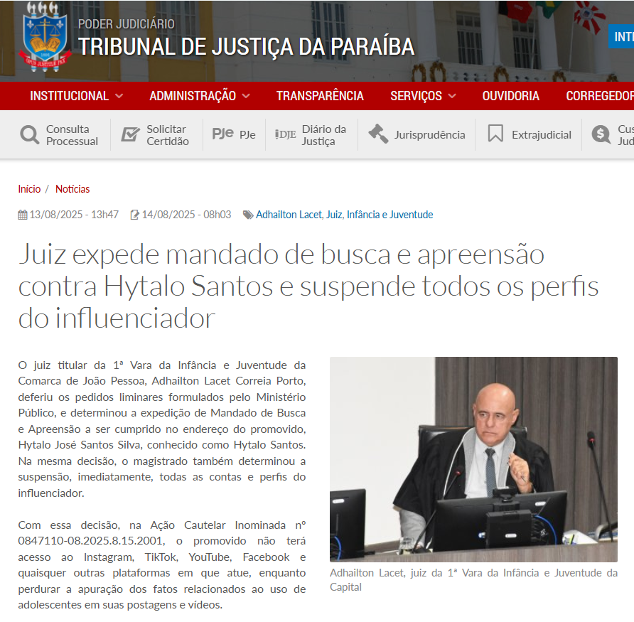 A divulgação no site do Tribunal de Justiça da Paraíba (TJPB) do mandado de busca e apreensão contra o influenciador Hytalo Santos antes de seu cumprimento pode ter prejudicado a eficácia da operação e levantado dúvidas sobre a segurança do procedimento.