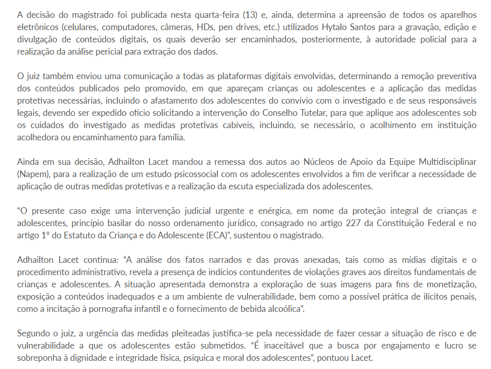 A decisão, assinada pelo juiz Adhailton Lacet, determinava a apreensão de celulares, computadores, câmeras e outros equipamentos usados pelo influenciador para gravação e edição de vídeos, além da suspensão imediata de todas as suas contas nas redes sociais.
