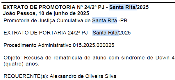 A 2ª Promotoria de Justiça de Santa Rita instaurou um Procedimento Administrativo para apurar uma grave denúncia contra o Instituto Educacional Caminhando com Jesus, localizado no município. A escola é acusada de negar a rematrícula do menino Alex Miguel Silva Martins, de apenas 4 anos, diagnosticado com síndrome de Down, sob a justificativa de que não teria condições financeiras de custear um auxiliar de sala.