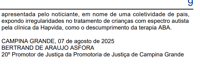 De acordo com o documento, a denúncia partiu de um noticiante que representa um grupo de pais insatisfeitos com o serviço prestado pela clínica. Eles relatam descaso no acompanhamento das crianças e, principalmente, o descumprimento da terapia ABA (Análise do Comportamento Aplicada), reconhecida como essencial para o desenvolvimento de pessoas com autismo.