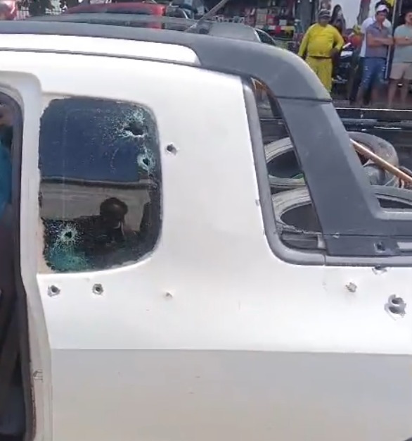 A cena foi de terror: o carro ficou com múltiplas marcas de tiros, e moradores registraram o momento de tensão logo após os disparos.