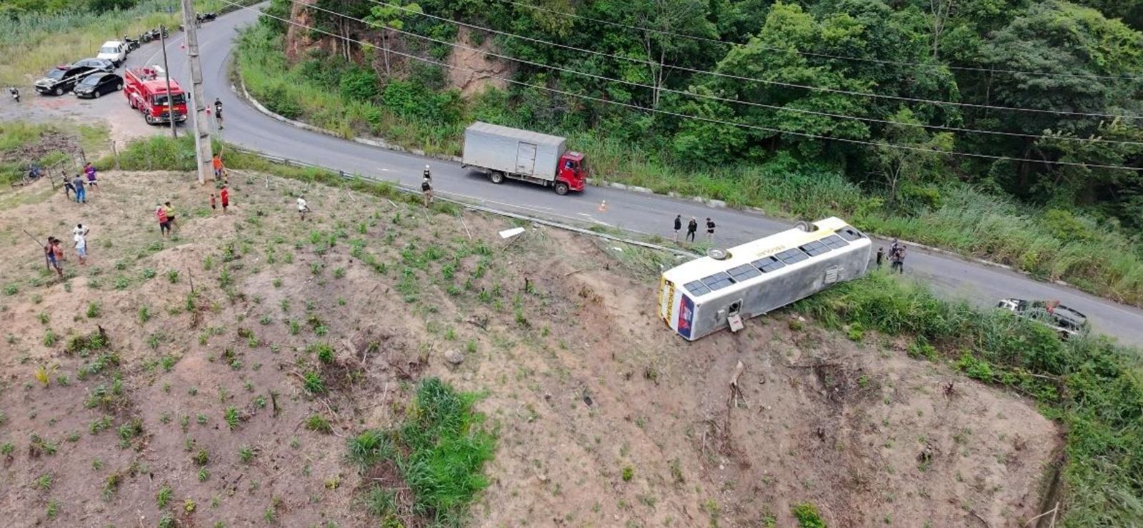 Ônibus escolar acidentado na PB-077, em Pilões, que deixou dois estudantes mortos e mais de 30 feridos.