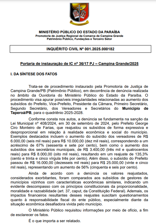 O Ministério Público da Paraíba investiga o aumento de salários de prefeito e vereadores na Paraíba, após denúncia sobre reajustes aprovados no município de Taperoá. O Inquérito Civil apura possíveis irregularidades nos aumentos destinados ao prefeito, vice, presidente da Câmara, vereadores e secretários. A investigação foi instaurada pela Promotoria de Justiça Regional de Campina Grande.