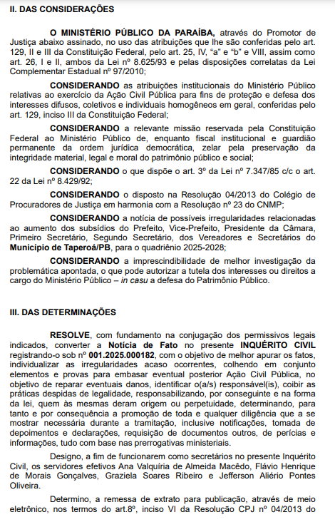 O Ministério Público requisitou informações sobre a situação e, com base na gravidade da denúncia, determinou a apuração detalhada dos fatos para verificar a legalidade e os impactos financeiros dessas mudanças nos salários. A investigação busca garantir que os princípios constitucionais sejam respeitados e que o município de Taperoá não sofra prejuízos financeiros indevidos.