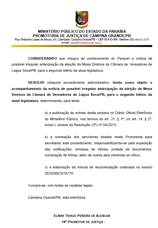 O Ministério Público da Paraíba (MPPB), por meio da 18ª Promotoria de Justiça de Campina Grande, instaurou um Procedimento Administrativo para apurar a antecipação da eleição da nova Mesa Diretora da Câmara Municipal de Lagoa Seca, no Agreste paraibano. A medida foi tomada após o órgão tomar conhecimento da possível irregularidade no processo, que teria ocorrido antes do período previsto em lei.