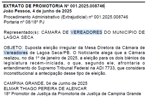 O Ministério Público da Paraíba (MPPB), por meio da 18ª Promotoria de Justiça de Campina Grande, instaurou um Procedimento Administrativo para apurar a antecipação da eleição da nova Mesa Diretora da Câmara Municipal de Lagoa Seca, no Agreste paraibano. A medida foi tomada após o órgão tomar conhecimento da possível irregularidade no processo, que teria ocorrido antes do período previsto em lei.
