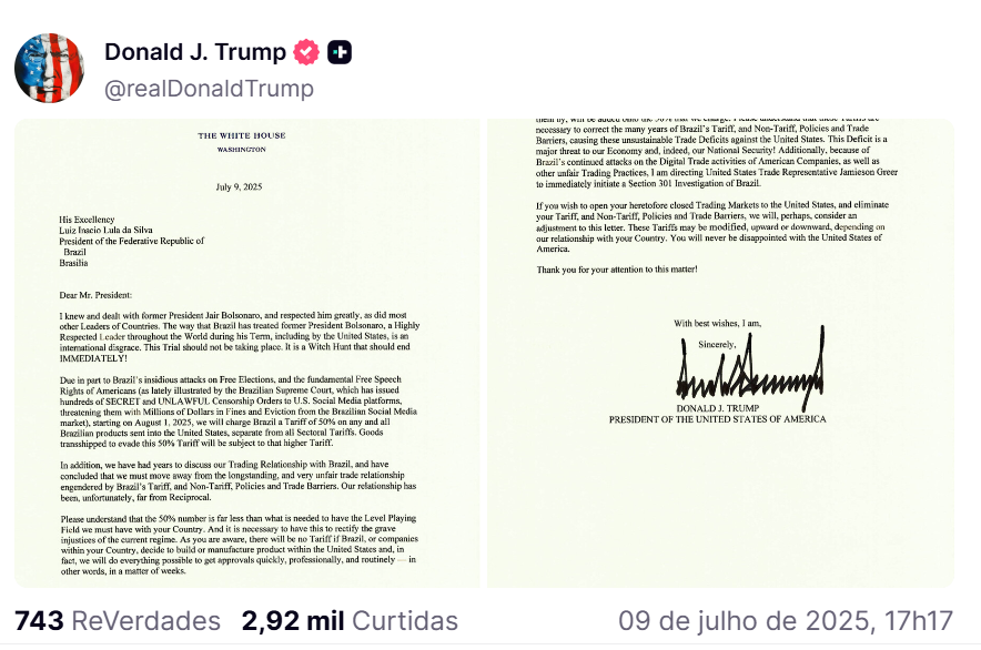 O presidente dos Estados Unidos, Donald Trump, anunciou nesta quarta-feira (9) a imposição de uma tarifa de 50% sobre produtos importados do Brasil, com entrada em vigor a partir de 1º de agosto de 2025. A medida foi divulgada por meio de uma carta oficial publicada em sua rede Truth Social, endereçada ao presidente Luiz Inácio Lula da Silva (PT).
