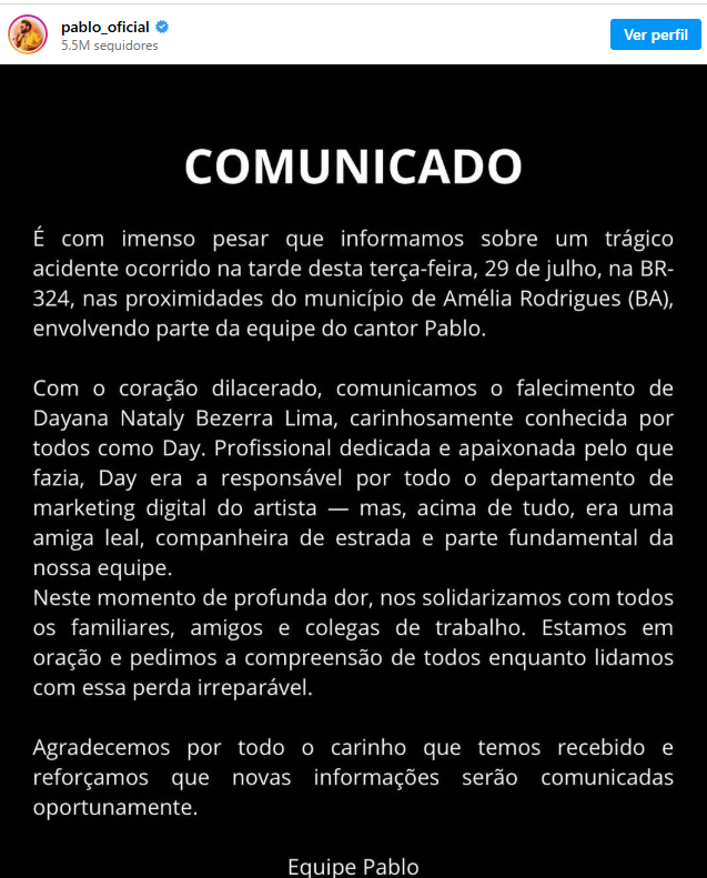 A paraibana Dayana Nataly Bezerra Lima, de 37 anos, integrante da equipe de marketing digital do cantor Pablo, morreu na tarde desta terça-feira (29) em um acidente na BR-324, no município de Amélia Rodrigues, na Bahia.